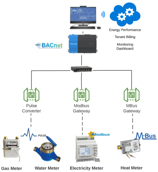 Heat meters readings can be collected via their MODBUS/MBUS interface